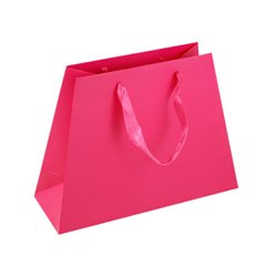 Dark Pink Pyramid Bags Matt Laminated with Ribbon Handles 33-23 x 25 x 12 Thickness : 190gsm Art Paper With Top & Bottom Reinforced Card Size(WxHxG): 33-23 x 25 x 12 cm( 13-9 x 9.84 x 4.72 inch)